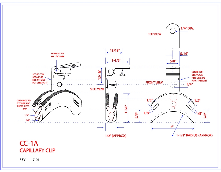 | ◊ Unit can hold three different sizes of capillary tubing ⅛”, ¼” and ⅜” ◊ Slots for tie anchors ◊ Inside tapered ridges allow tubing to be snapped in place ◊ Mounting in either horizontal or vertical planes ◊ Corner slot accepts 1/4" sensors ◊ Clips can be separated into two parts • Use one as a capillary mounting clip • The other part can be used as a sensor mounting bracket ◊ Plenum rated, class 94V-2 nylon ◊ Available in NATURAL, BLACK & GRAY |